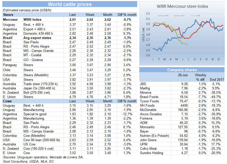 育肥牛市場各州的表現(xiàn)不同,圣保羅前幾周牛價保持不變,140亞雷爾,北部由于供應(yīng)短缺牛價上漲,其他州由于廠家和農(nóng)場銷售協(xié)議快到截止日期還未達(dá)成,廠家處于壓價的有利位置。國內(nèi)批發(fā)市場需求不高,庫存沒有得到消耗,導(dǎo)致零售價格降低。預(yù)期七月初因?yàn)閲鴥?nèi)需求增加活牛價格會增長。