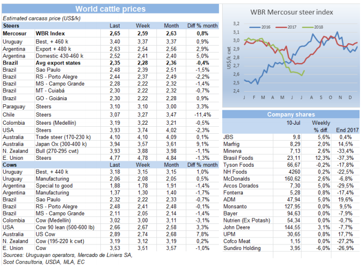 本周南方共同市場閹牛價(jià)格復(fù)蘇,主要原因除了各國貨幣增值,還包括活牛市場的穩(wěn)定,本周從2.59美金/公斤漲到2.65。本周巴西雷亞爾增值2.7%,阿根廷比索增值3.3%,此外巴西平均牛價(jià)增長了0.5%到134.1雷亞爾,因此巴西育肥牛價(jià)格漲了7美分到2.35美金,阿根廷本地牛價(jià)保持穩(wěn)定,但貨幣增值導(dǎo)致美金價(jià)漲了9美分至2.63美金。烏拉圭牧場的活牛供應(yīng)非常短缺,由于481配額的原因需求也在增加,所以價(jià)格呈上漲趨勢,巴拉圭活牛價(jià)格本周沒有變化。