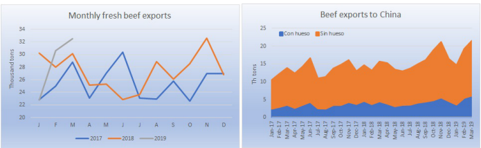 中國(guó)市場(chǎng)作為烏拉圭牛肉最主要的買(mǎi)家份額還在增長(zhǎng),三月份共進(jìn)口21511噸牛肉,占烏拉圭總出口量32458噸的66%,創(chuàng)下新的月度紀(jì)錄,中國(guó)采購(gòu)了6071噸帶骨和15440噸去骨牛肉。第一季度帶骨牛肉銷售量漲了18%,而去骨牛肉漲了31%,均價(jià)也有增加,帶骨均價(jià)3246美金離岸價(jià),上漲9%,去骨牛肉4512美金離岸價(jià),上漲4%。北美市場(chǎng),主要是美國(guó)市場(chǎng)排名第二,第一季度共進(jìn)口12880噸牛肉,同比增長(zhǎng)12%。三月份以色列市場(chǎng)排第三,進(jìn)口1071噸,但進(jìn)口量同比跌了68%。