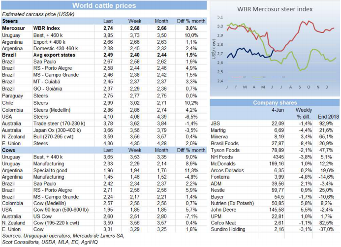 南方共同市場(chǎng)閹牛價(jià)格上漲6美分到2.74美金/公斤,三月中以來(lái)最高,主要驅(qū)動(dòng)力來(lái)自巴西雷亞爾,雖然對(duì)經(jīng)濟(jì)增長(zhǎng)減速有所擔(dān)憂,本周還是增值3.5%,主要出口州牛價(jià)只上漲了0.3雷亞爾/15公斤,到141雷亞爾,但換算成美金牛價(jià)上漲了9美分到2.49美金。烏拉圭活牛市場(chǎng)還是過(guò)熱,閹牛價(jià)格本周再度上漲12美分,比其他國(guó)家都高了1美元/公斤以上。阿根廷和巴拉圭牛價(jià)沒有變化。