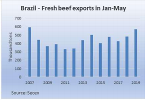 巴西牛肉出口量還在穩(wěn)步增加,由于全球?qū)?dòng)物蛋白需求增長(zhǎng),五月牛肉、豬肉以及禽肉出口量都有增加,五月牛肉出口量達(dá)到12.1萬(wàn)噸,同比增加34%,均價(jià)3883美金,同比降低7.1%。前五個(gè)月巴西共出口56.7萬(wàn)噸,均價(jià)3780美金,出口量同比增加18.2%,均價(jià)下跌7.4%。五月豬肉出口量5.81萬(wàn)噸,2017年八月以來(lái)最高。