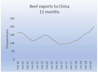 截止到五月的十二個(gè)月內(nèi)澳洲共對(duì)中國(guó)出口19.9萬(wàn)噸牛肉,同比兩年前的9.6萬(wàn)噸翻倍還多。對(duì)中國(guó)出口穩(wěn)步增長(zhǎng),五月中國(guó)是澳洲牛肉第三大主要出口市場(chǎng),共進(jìn)口2.3萬(wàn)噸,僅比美國(guó)少355噸,日本還是最大市場(chǎng),進(jìn)口2.68萬(wàn)噸。五月澳洲共出口10.55萬(wàn)噸牛肉,同比減少4200噸,截止五月澳洲共出口46.9萬(wàn)噸,同比增加8%。