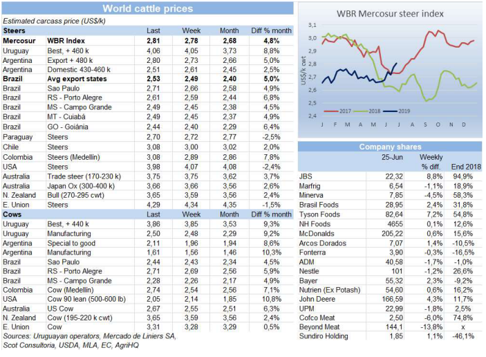南方共同市場閹牛價格本周又增長了3美分到2.81美金/公斤,自五月上旬以來已經(jīng)上漲了15美分,主要是受美元疲軟因素驅(qū)動,阿根廷比索增值2.6%,四月中以來最高,巴西雷亞爾增值0.8%,三月中以來最高。巴西主要出口州育肥牛價格上漲1雷亞爾到141.5雷亞爾/15公斤,美金牛價漲了4美分到2.53美金/公斤,阿根廷牛價略微下調(diào),但比索增值導致美金牛價漲了7美分到2.8美金,烏拉圭牛價上行似乎失去了動力,本周只漲了1美分,而巴拉圭牛價處于熊市,本周2.7美金/公斤。
