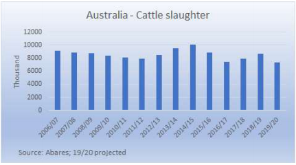 澳洲牛只屠宰量、牛肉產(chǎn)量和出口量2019/20年將會減少