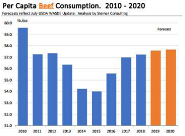 USDA在六月存欄報(bào)告出來之后對(duì)供應(yīng)/需求平衡表做了微調(diào),2019年預(yù)測牛肉產(chǎn)量調(diào)低了7500萬磅,主要原因是平均胴體重量比預(yù)期低,并且第三季度屠宰量也有下行的趨勢。產(chǎn)量的減少會(huì)被需求端的調(diào)整抵消一部分,進(jìn)口量將增加1000萬磅,出口量會(huì)減少1000萬磅,此外人均牛肉消費(fèi)量也被調(diào)低,僅會(huì)同比增長0.6%。不過USDA對(duì)2020年的預(yù)測數(shù)據(jù)并沒有進(jìn)行調(diào)整,而且雖然牛肉供應(yīng)量將減少,USDA還是把2019年閹牛價(jià)格預(yù)測調(diào)低了1.3%。