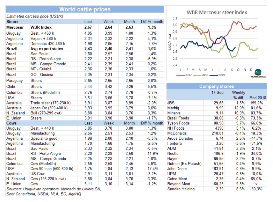 17家巴西工廠準(zhǔn)入中國(guó)市場(chǎng)對(duì)近幾周行情漲勢(shì)并沒有產(chǎn)生實(shí)質(zhì)影響。烏拉圭市場(chǎng)中國(guó)還在持續(xù)出價(jià),合同都不需要重新談判就能成交。新進(jìn)入中國(guó)市場(chǎng)的工廠并沒有報(bào)出可能影響未來市場(chǎng)價(jià)格的“驚爆”盤,這些工廠的報(bào)價(jià)比現(xiàn)有成交價(jià)格都還高。中美商務(wù)關(guān)系嚴(yán)峻背景下的平靜可能對(duì)進(jìn)口商有利。中國(guó)從美國(guó)進(jìn)口大豆,宣布不會(huì)以更高的關(guān)稅懲罰油籽和美國(guó)豬肉,預(yù)計(jì)中美貿(mào)易戰(zhàn)將降溫,經(jīng)濟(jì)前景將有改觀,人民幣價(jià)格將改善。關(guān)于被授權(quán)的巴西工廠情況,只有Marfrig、Minerva這些大廠已經(jīng)從新工廠出口了,因?yàn)樗麄兛梢詮闹耙呀?jīng)出口中國(guó)的廠獲得衛(wèi)生證和標(biāo)簽,但小廠還在等待本周中國(guó)對(duì)他們標(biāo)簽可以裝船的最終簽注。這17家工廠計(jì)劃每月出口40-60柜(總重約2.5萬噸),八月巴西對(duì)中國(guó)出口量3.7萬噸。烏拉圭接下來兩周預(yù)計(jì)屠宰率低,一些廠的貨已經(jīng)賣光,報(bào)盤十分有限。阿根廷水漂貨市場(chǎng)盡管有一些商品流出,交易仍然蕭條,牛副仍然鮮有問津。巴拉圭出口臺(tái)灣活躍,前后腱,肋排肉芯,前部位肉例如肩胛背肩4000美元/噸。烏拉圭出口越南掠奪牛前3150美元/噸。