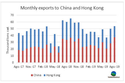 八月巴西對(duì)中國(guó)港口直接牛肉出口量達(dá)3,7292噸,創(chuàng)新紀(jì)錄。銷往香港牛肉量減少至1,6576噸,兩者總計(jì)5.4萬噸,是自2018年11月以來的最大。出口埃及1,8590噸,超過中國(guó)香港,本年度截至八月,累計(jì)出口至北非國(guó)家11.1萬噸,比去年同期增長(zhǎng)12%。巴西對(duì)其他國(guó)家年度出口總量中的第四位是阿拉伯聯(lián)合酋長(zhǎng)國(guó),與2018年的5.1萬噸相比,其購(gòu)買量增加了五倍以上。