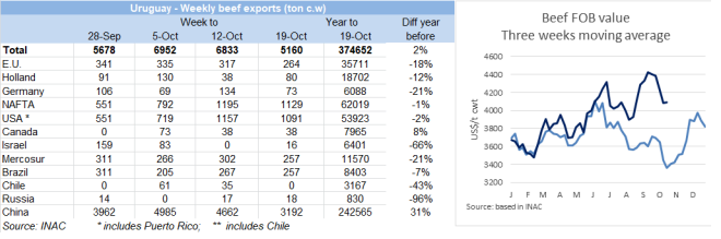 9月冷鮮、冷凍和加工類牛肉出口達(dá)54729噸,價(jià)值約2.98億美元。這些數(shù)字表明了出口量同比增長(zhǎng)61.6%,收益增長(zhǎng)了72.4%,這兩種計(jì)量方式的差異是因?yàn)槌隹趦r(jià)格的上漲,年度增長(zhǎng)6.7%,出口價(jià)格上漲在冷鮮去骨產(chǎn)品和冷凍去骨產(chǎn)品中表現(xiàn)并不均衡。9月去骨冷鮮產(chǎn)品報(bào)價(jià)8700美元/噸,比2018年9月上漲1.5%,冷凍去骨產(chǎn)品達(dá)5000美元/噸離岸價(jià),比去年增長(zhǎng)22.5%。