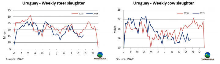 上周牛屠宰量輕度回漲。烏拉圭肉協(xié)報(bào)道。上周牛只屠宰量34563頭,比前一周增長(zhǎng)1165頭,增長(zhǎng)3.5%,比去年同期減少1.2萬(wàn)頭,去年同期屠宰量4.6萬(wàn)頭。春季還未完全到來(lái),這為牛只育肥帶來(lái)困難。本周屠宰量增長(zhǎng)主要來(lái)自閹牛,閹牛屠宰量15792頭。增長(zhǎng)了13%,母牛屠宰量增長(zhǎng)了500頭,增長(zhǎng)至13404頭,幼母牛減少了1000頭,減少至4703頭。屠宰量活動(dòng)最為活躍的廠是 Minerv-PUL(3972頭),Marfrig-Tacuarembo(3349頭),Las Piedras(3246頭)。Marfrig四家工廠共屠宰11097頭牛,屠宰量比上周增加619頭。10月截至26日,牛只屠宰量130700頭,比去年同期減少4萬(wàn)頭,與去年相比差距繼續(xù)拉大,這將是2013年以來(lái)10月份的最低水平。今年截至目前牛只屠宰量184萬(wàn)頭,比去年減少9.1萬(wàn)頭。阿根廷