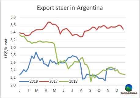 本周關(guān)于新任政府可能會提高肉類出口稅率的猜想發(fā)布,隨著時間的推移成為政府計劃要做的一則有效信息。這一構(gòu)想包含減免高貨值部位肉(例如臀腰肉)稅率、加征低貨值產(chǎn)品稅率(如肋排),以便其主要在國內(nèi)市場的消費(fèi)。除了引起了生產(chǎn)者對此事以及造成的后果的反對,工廠還排除了這種想法的可行性,因為關(guān)稅不能依照不同的部位而設(shè)定。
