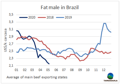 自疫情開始襲擊南美地區(qū)以來,南方共同市場閹牛平均價格保持下行趨勢。本周閹牛價格2.34美元/公斤,較上周下跌4美分,較2月末下跌64美分,下跌了21.5%。本周巴西貨幣貶值仍然是主導因素,疫情對巴西政治和公共衛(wèi)生方面的影響導致其貨幣再次貶值1.5%,較2月末貶值27.4%。巴拉圭活牛價格下跌也拉低了該地區(qū)閹牛價格指數(shù),巴拉圭待宰活牛價格本周下跌20美分,下跌至2美元/公斤。阿根廷和烏拉圭本周參考價格保持穩(wěn)定。