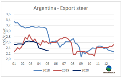 雖然在隔離令開始時,阿根廷國內(nèi)市場的牛肉消費出現(xiàn)反彈,但隨著實行社會補貼,最初的熱情逐漸消退。一位市場專家指出,這些天來,恐慌累積導致許多產(chǎn)品的需求下降,原因是家庭預算問題,信用卡的使用時間縮短到月底。牛肉是受到影響的一種商品,價格與國外市場相比很低,本地也沒有其他的食物的競爭,這反映出供應多而價格下跌。此外閹牛的需求端出現(xiàn)問題,國內(nèi)需求僅能消費牛肉產(chǎn)量的四分之三。
