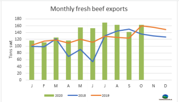 澳大利亞長期的干旱和季節(jié)性條件的改善導(dǎo)致活牛供應(yīng)緊張,因為生產(chǎn)者繼續(xù)重建牛群。因此,到印度尼西亞出口的體重較小的閹牛價格在2020年達歷史最高,9月的平均價格比去年同期高出13%。由于供應(yīng)受限和價格高位,出口量遠低于一年前的水平。9月活牛出口量達7.8萬頭,較去年同月回落28%。今年1-9月的出口量較2019年水平回落了12%。MLA的養(yǎng)牛業(yè)預(yù)測 10月更新表明,2020年活牛出口預(yù)計將下降16%,主要是由于澳大利亞北部供應(yīng)水平的下降。