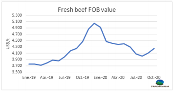 十月巴西牛肉出口量162685噸,平均離岸價4244美元/噸。10月出口量較上年增長2600噸(較上年少兩個工作日),平均價格同比下跌5%,但仍然是今年六月以來最高。今年1-10月牛肉出口量達141萬噸,較上年增長了20萬噸。