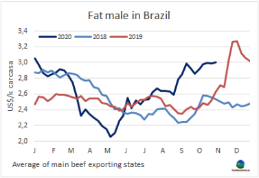 供應(yīng)短缺、月初的高需求和出口市場的良好表現(xiàn)繼續(xù)支撐巴西主要牛產(chǎn)區(qū)活牛價格上漲。圣保羅方面參考價達270雷亞爾/15公斤。為中國市場準備的小閹牛價格能多賣2雷亞爾/15公斤。批發(fā)市場價格受月初需求拉動也有上漲,十月胴體參考價17.8雷亞爾/公斤,較上月上漲約10%。批發(fā)市場后部位肉緊缺,接下來幾天價格可能再次上漲。