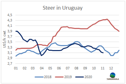 大多數(shù)計劃抵達南美地區(qū)的猶太屠宰員工已經(jīng)與最近幾個小時抵達。有一些屠宰團隊由于不同的隔離限制仍未開始屠宰。進口商向記者證實,四個屠宰團隊開始屠宰后巴拉圭牛前的參考離岸價6000美元/噸,巴西工廠也同意以這個價格成交。巴拉圭方面的參考價給烏拉圭、阿根廷等其他國家在簽合同時提供了有力的價格參考。烏拉圭成交價6800美元/噸,好的品牌可以成交到7000美元/噸離岸價。阿根廷成交價差異很大,質(zhì)量差的成交價7400美元/噸,布宜諾斯艾利斯附近的工廠成交價8000美元/噸,業(yè)內(nèi)人士稱仍有一些口碑較好的工廠可以賣到8000美元/噸以上。新冠疫情仍然是不確定因素,以色列市場牛肉量很小,但沒有人可以確定屠宰團隊是否可以按計劃完成屠宰。因此,對南方共同市場的出口商來說當歐洲市場消費不振,中國由于新年來臨開始慢慢失去活力,而美國的需求水平和進口價格也沒有顯示出任何復(fù)蘇的跡象時,以色列市場是前部位肉的好去處。