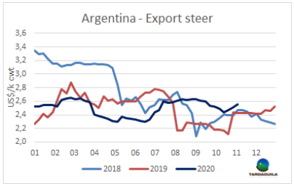 近兩周出口閹牛價格再次上漲,累計上漲了11比索/公斤。最好的英國純種閹牛價格上漲3-5比索,上漲至197-203比索/公斤。印度串種閹牛價格上漲3-7比索,目前價格在190-200美元/公斤波動。特優(yōu)母牛價格再次上漲,上漲了7-10比索/公斤,價格可以達到閹牛種類的最低價,190-195比索/公斤,兩周內(nèi)價格累計上漲了19比索/公斤。價格上漲最多得是用于到中國市場出口的母牛,工業(yè)母牛價格上漲了8-10比索/公斤,本周成交價在180-188比索/公斤,近三周價格累計上漲28比索/公斤。
