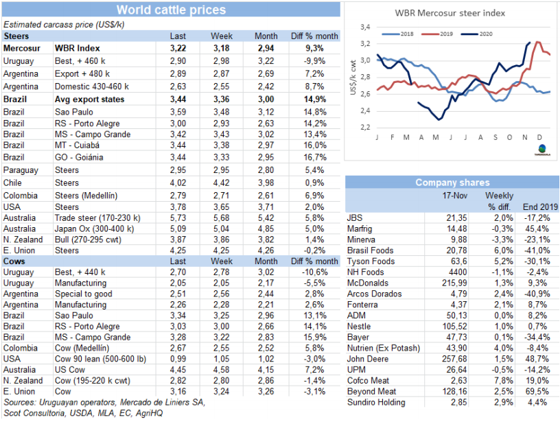 南方共同市場閹牛價格指數(shù)本周再次上漲4美分,上漲至3.22美元/公斤,達(dá)2019年11月至今一年以來最高。影響閹牛價格指數(shù)上漲的主要因素還是巴西牛價,盡管近幾周來上漲趨勢有可能停止的跡象。股市指標(biāo)大幅上升,包括雷亞爾在內(nèi)的新興國家貨幣也大幅上升。巴西主要出口州育成牛價格本周上漲8美分,上漲至3.44美元/公斤,拉大了與其他地區(qū)的差距。巴西牛價上漲是由于本地牛價上漲和匯率上漲導(dǎo)致的。阿根廷和巴拉圭牛價保持堅挺,本周上漲2美分,阿根廷出口閹牛價格上漲至2.98美元/公斤,包含9%的出口稅。巴拉圭牛價保持2.95美元/公斤。烏拉圭牛價下行趨勢仍然持續(xù),草飼閹牛2.9美元/公斤,較阿根廷僅高1美分,阿根廷牛價仍為南美地區(qū)最低。