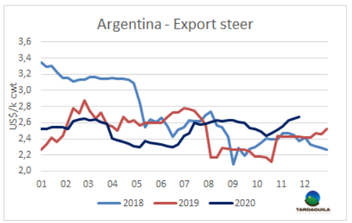 閹牛價(jià)格再次上漲,特種閹牛價(jià)格上周一周內(nèi)上漲了5-10比索,達(dá)214-218比索/公斤,串種閹牛價(jià)格上漲了10比索,成交價(jià)210-214比索/公斤,特優(yōu)母牛價(jià)格上漲了8比索至200-205比索/公斤,主要用于中國(guó)市場(chǎng)的工業(yè)母牛上漲了2-5比索,至185-190比索/公斤。