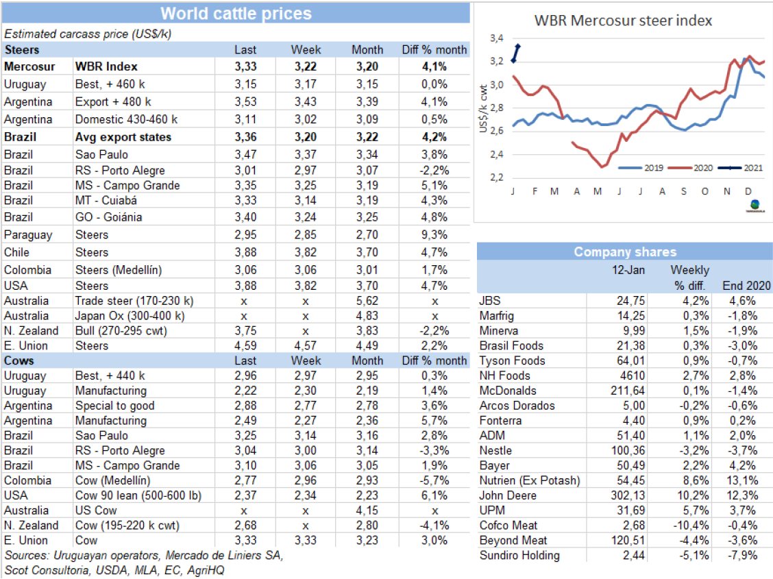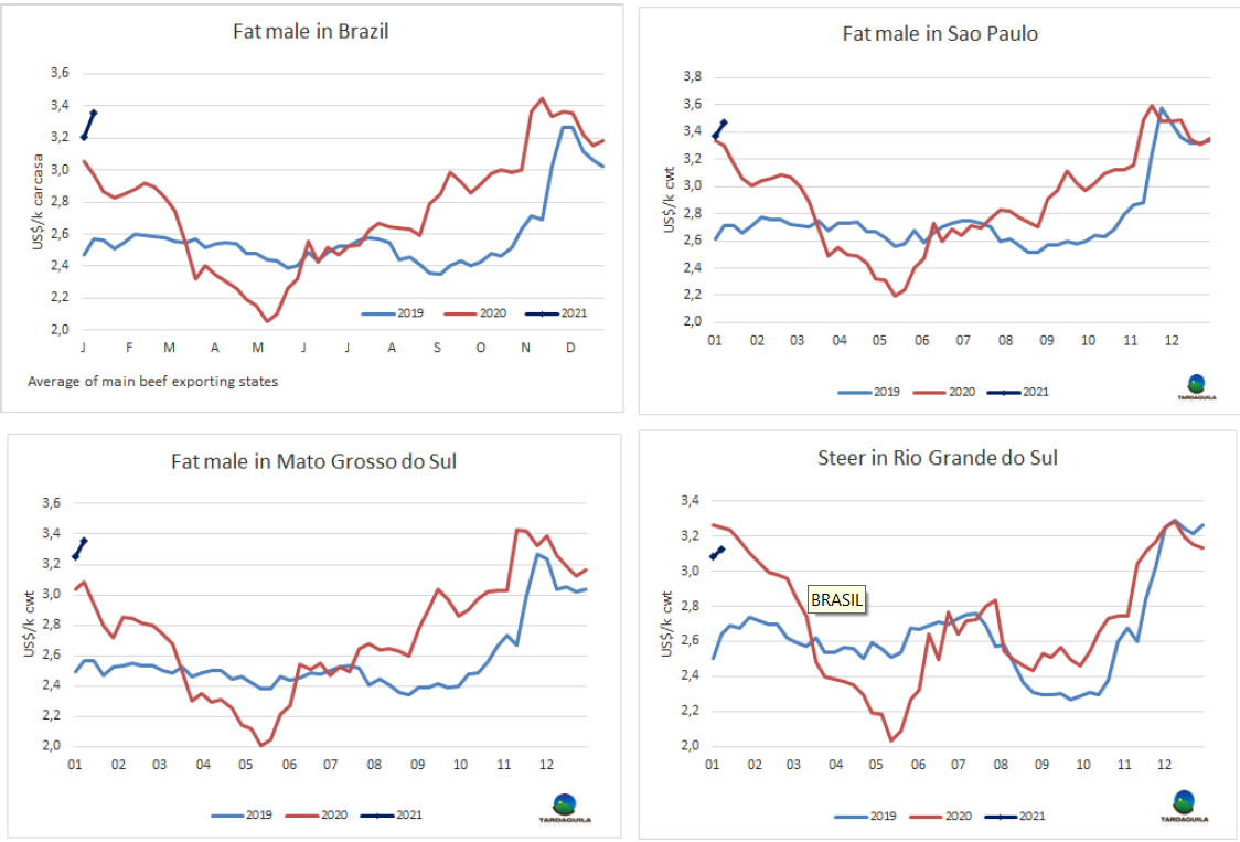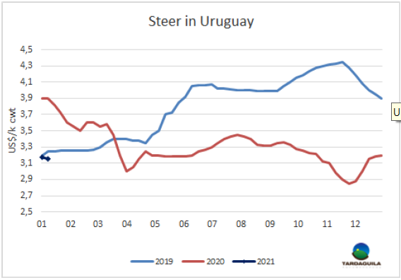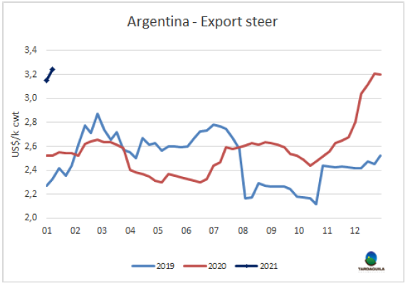 育成牛價格連續(xù)11周累計上漲了31%之后,在年初價格小幅下跌,預(yù)計出口活牛價格將繼續(xù)下跌。一方面由于出口稅的原因,1月份通常比在12月份更方便生產(chǎn)商銷售,另一方面國內(nèi)需求受隔離影響減弱和一些國際市場尤其是歐洲市場的困難。然而,在沒有明確的理由支持這種復(fù)蘇的情況下,牛價又恢復(fù)了上漲的趨勢。最好的英國純種閹牛價格下上漲了10比索,至270-280比索/公斤,串種閹牛價格上漲了10-15比索至265-275比索/公斤,特優(yōu)母牛價格保持232-242比索/公斤,主要出口至中國的工業(yè)母牛價格上漲了2-4美分,215-218比索/公斤。