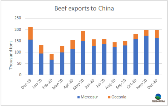 根據(jù)主要出口國的出口數(shù)據(jù)和阿根廷的預(yù)估出口數(shù)據(jù),12月全球兩大主要供應(yīng)商南美和澳洲對中國出口量保持20萬噸,與11月水平相當。11月和12月出口數(shù)據(jù)的差異在于澳洲的出口量占比增大,尤其是來自新西蘭的出口量,新西蘭出口量約2萬噸,達2019年12月以來最大。新西蘭的出口量增加是由于船期變短了。因為這些產(chǎn)品需在春節(jié)前到港。目前,南美目前的大部分12月裝船的產(chǎn)品很難趕上春節(jié)到港。南美對中國出口量約達16.3萬噸,較11月減少了1萬噸。12月澳洲對中國牛肉出口量3.5萬噸,較11月增長了9%。12月這兩個地區(qū)的出口量較2019年12月下降了12%,盡管南美地區(qū)對中國出口量增長了7%,也沒能抵消澳洲對中國出口量同比2萬噸的下降。