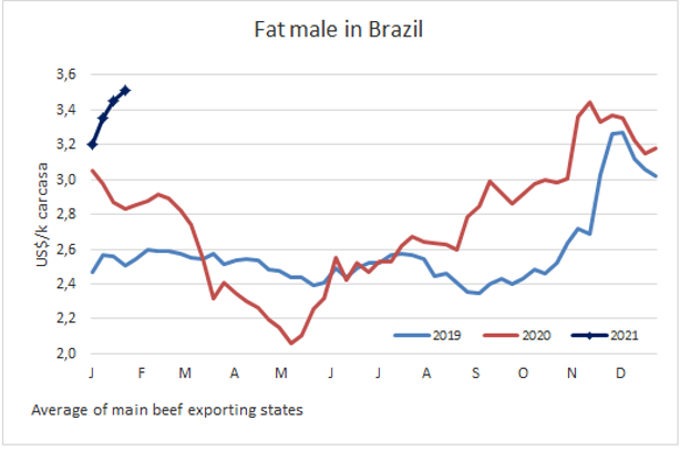 待宰牛數(shù)量的短缺將支撐巴西育肥牛價格到三月末四月初保持堅挺。目前,飼養(yǎng)場沒有足夠數(shù)量的育肥牛,也沒有用于補欄的牛?!北M管市場預(yù)期堅挺,價格不會超過12月的高點,因為當(dāng)時的需求更高。巴西的活牛市場正在經(jīng)歷存欄重建的階段,但 “這只是一個開始”,因此還不會對小牛生產(chǎn)產(chǎn)生重大影響。因此,預(yù)計小牛價格也將保持堅挺。美麗華在巴西以外的子公司Athena Foods以3億美元的總價從JBS收購了Canelones肉類工廠,包括JBS在巴西以外的南美(阿根廷、巴拉圭和烏拉圭)所有部門。