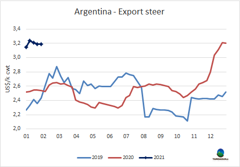 出口閹牛價格連續(xù)第二周保持穩(wěn)定,最好的出口閹牛價格保持上周的水平,最好的英國純種閹牛價格270-280比索/公斤,串種閹牛價格265-275比索/公斤,特優(yōu)母牛價格保持232-242比索/公斤,主要出口至中國的工業(yè)母牛參考價210-218比索/公斤。