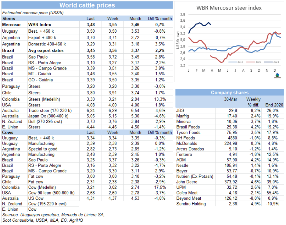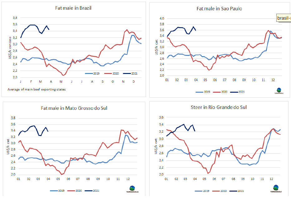 對(duì)于疫情發(fā)展的擔(dān)憂和巴西內(nèi)閣部長的換屆給巴西貨幣價(jià)值造成影響。巴西雷亞爾較美元貶值了4.4%。因此盡管巴西按雷亞爾計(jì)的育肥牛價(jià)格繼續(xù)上漲,轉(zhuǎn)換成美元價(jià)格后本周下跌了11美分至3.45美元/公斤。本周其他地區(qū)牛價(jià)保持不變。南方共同市場牛價(jià)下降了7美分至3.48美元/公斤。