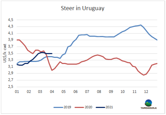育成閹牛的價(jià)格下行持續(xù)時(shí)間很短,最近降雨雖然不大,但供應(yīng)端不急出售。參考價(jià)與上周相同,特種閹牛3.5美元/公斤,重型母牛3.3美元/公斤,45天付款包含運(yùn)費(fèi)。對(duì)母牛的采購興趣要強(qiáng)于閹牛,因?yàn)槟概5纳a(chǎn)主要是面向中國市場,而歐洲市場非常低迷,猶太屠宰團(tuán)隊(duì)也沒有開工。期貨的預(yù)定時(shí)間在一周左右。烏拉圭新冠病例不斷增長迫使工廠不得不充分利用工作日全面生產(chǎn),因?yàn)橐坏┯泄S發(fā)現(xiàn)新冠病例工廠將停工數(shù)日。由于目前的供應(yīng)相對(duì)于需求仍處于短缺狀況,預(yù)計(jì)復(fù)活節(jié)周之后市場將恢復(fù)堅(jiān)挺。