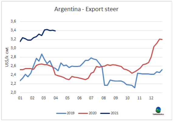 據(jù)阿根廷牛肉出口局?jǐn)?shù)據(jù),2月牛肉出口量環(huán)比下降了7.6%達(dá)45055噸,但仍然較2020年2月出口量增長了31.1%。出口貨物的出口額 (不包括內(nèi)臟)達(dá)1.863億美元,比去年同期增長了5.1%。出口量和出口額之間的差異是因?yàn)?span lang="EN-US">2月的平均出口價(jià)格(與上月幾乎相同)比2020年2月低19.8%。冰鮮去骨牛部位肉的離岸價(jià)為6650美元/噸(每年下降13.3%),而冷凍去骨部位肉的平均離岸價(jià)超過4100美元/噸(比2020年2月減少8.5%)。