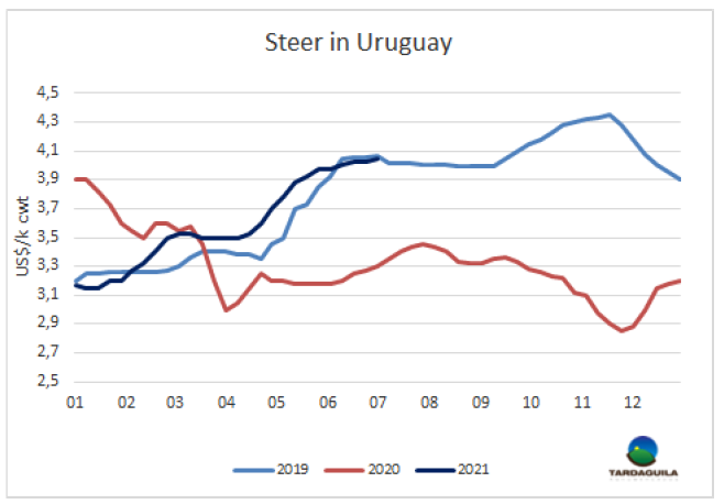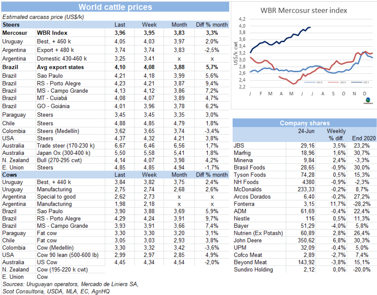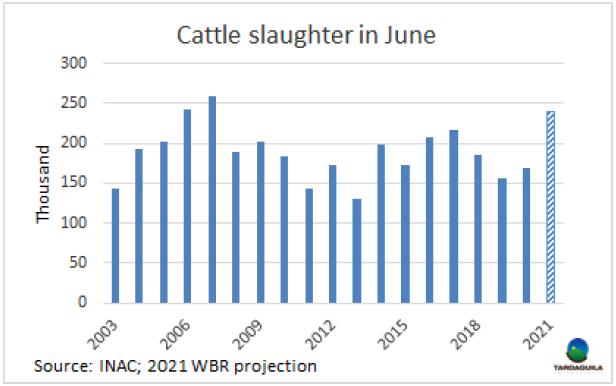 上周牛屠宰量再次增長(zhǎng),據(jù)烏拉圭肉協(xié)報(bào)告統(tǒng)計(jì),截止6月26日的一周,屠宰量56395頭,較上周增長(zhǎng)了8000頭,較去年同期增長(zhǎng)了18000頭。這是今年屠宰量第三大的一周。盡管481配額的屠宰結(jié)束,燕麥飼養(yǎng)的牛出欄延期,但采購(gòu)需求堅(jiān)挺帶動(dòng)屠宰量增長(zhǎng),所有種類的牛,無論好壞,都被買走了。本周屠宰量增長(zhǎng)最大的是閹牛,本周增加了4301頭至25530頭(+20.3%),母牛屠宰量增加了3181頭至23214頭,小母牛屠宰量增加了457頭,至6250頭。屠宰量最大的工廠是Tacuarembo(4718頭),Ontilcor(4469頭),Las Piedras(4385頭)。Marfrig四家工廠屠宰總量14380頭, Athena三家工廠屠宰總量12164頭。據(jù)本月結(jié)束僅剩3個(gè)工作日,六月屠宰量已達(dá)208093頭,本月屠宰量將超過24萬頭,較2020年六月約增長(zhǎng)7萬頭,是6月屠宰量第三大的年份,僅次于2006年和2007年。今年前半年牛屠宰量將達(dá)124萬頭,較去年增長(zhǎng)了29.1萬頭,增長(zhǎng)了31%。