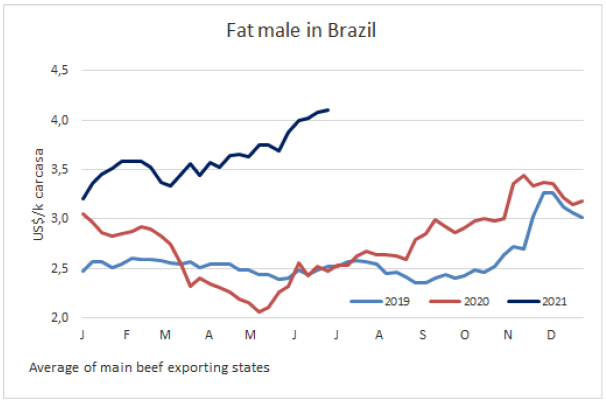 南方共同市場(chǎng)閹牛價(jià)格保持堅(jiān)挺,南方共同市場(chǎng)閹牛價(jià)格指數(shù)本周上漲了1美分至3.96美元/公斤,達(dá)2010年該指數(shù)統(tǒng)計(jì)以來最高。巴西主要出口州育肥牛價(jià)格保持不變,由于雷亞爾升值,美元價(jià)格上漲了2美分至4.1美元/公斤。其余地區(qū)市場(chǎng)堅(jiān)挺,參考價(jià)保持穩(wěn)定。
