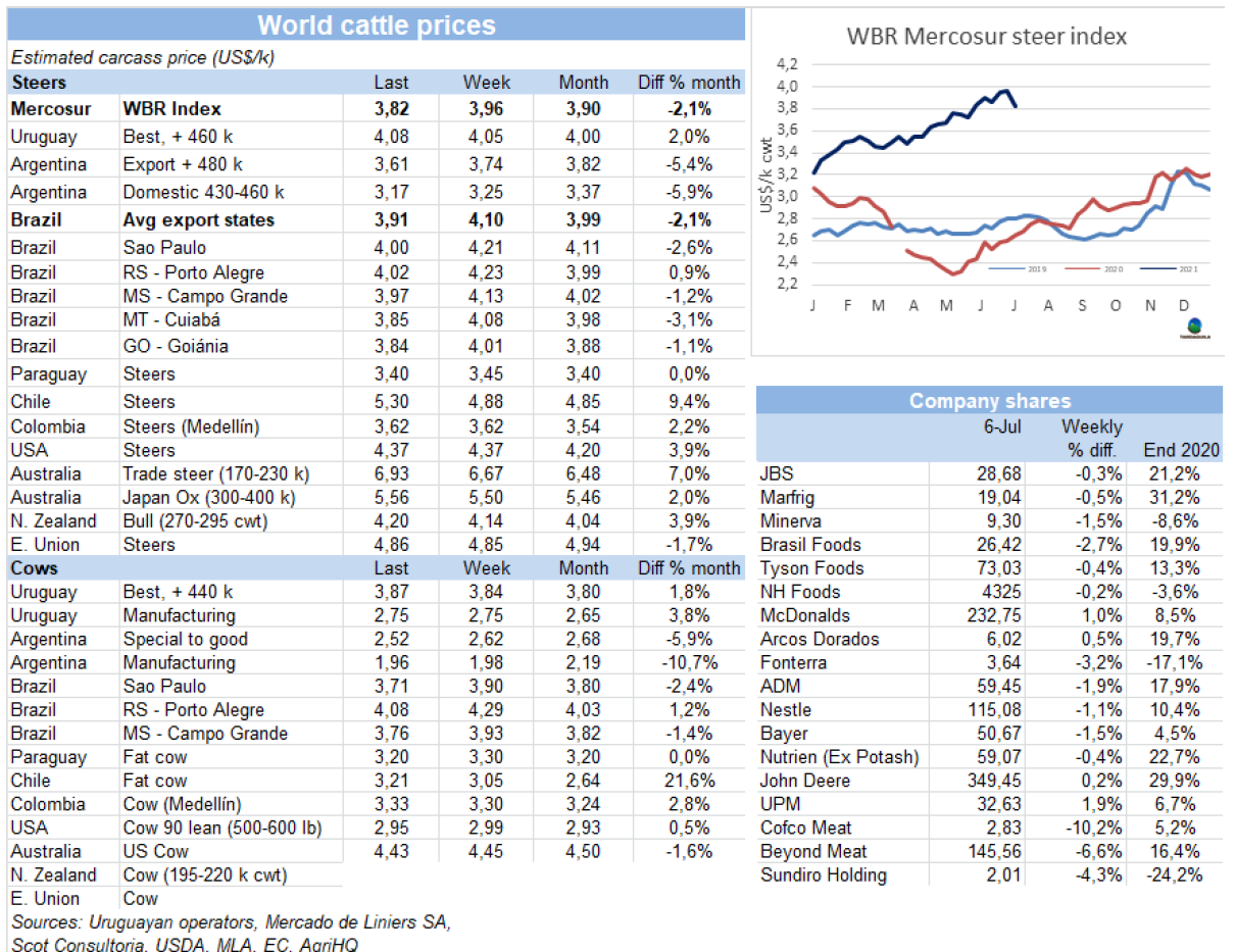 博索納羅政府提出的有關(guān)應(yīng)對(duì)疫情的政治問(wèn)題正在對(duì)巴西匯率產(chǎn)生影響。美元對(duì)雷亞爾匯率本周上漲5.2%,至5.20雷亞爾,為六周以來(lái)的最高水平。這使主要牛產(chǎn)區(qū)的育肥牛價(jià)格下降19美分,至3.91美元/公斤。阿根廷和巴拉圭方面牛價(jià)也有下跌,阿根廷出口閹牛價(jià)格下跌13美分至3.61美元/公斤,巴拉圭的寒冷天氣導(dǎo)致待宰牛價(jià)格下跌5美分至3.4美元/公斤。烏拉圭特種閹牛參考價(jià)上漲至4.08美元/公斤。南方共同市場(chǎng)閹牛價(jià)格指數(shù)下跌了14美分至3.82美元/公斤。