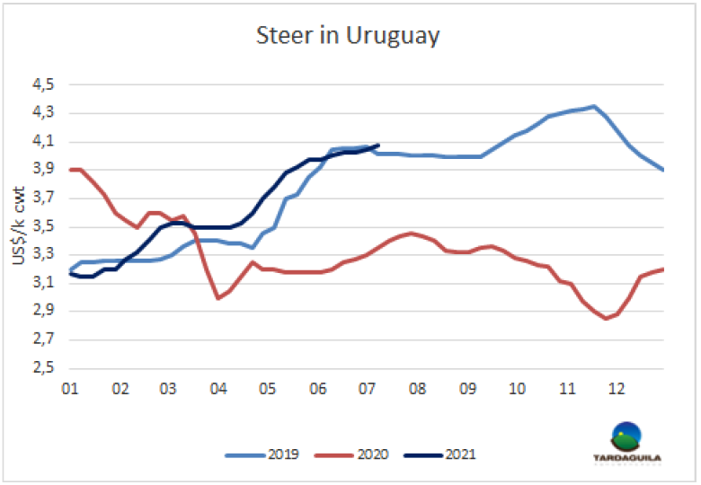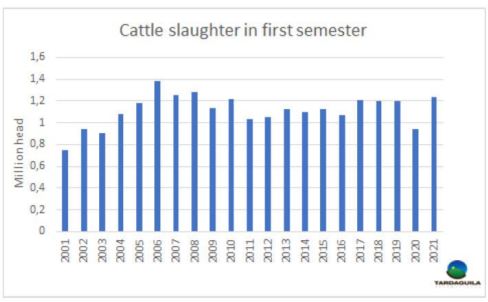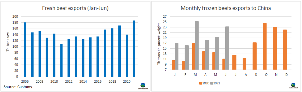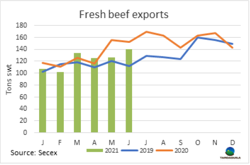 順暢的牛肉出口為激烈的屠宰節(jié)奏提供有利條件。6月,烏拉圭牛肉累計(jì)出口量37230噸,今年上半年牛肉總出口量達(dá)187262噸的歷史新高,超過(guò)2006年同期的最高水平,比2020年同期高出4.7萬(wàn)噸。同時(shí),出口價(jià)格上漲,6月平均牛肉出口價(jià)格5749美元/噸,較上月上漲了3.3%,較去年同期上漲了10%。中國(guó)市場(chǎng)采購(gòu)量占6月出口總量的62.6%,約23143噸,上半年烏拉圭對(duì)中國(guó)出口量比去年增長(zhǎng)了57%,達(dá)119329噸。烏拉圭對(duì)美國(guó)出口量也有增長(zhǎng),冷凍牛肉對(duì)美國(guó)歐出口量約4198噸;以色列排在第三位,烏拉圭對(duì)以色列牛肉出口量達(dá)1574噸,較去年同期增長(zhǎng)了87%。