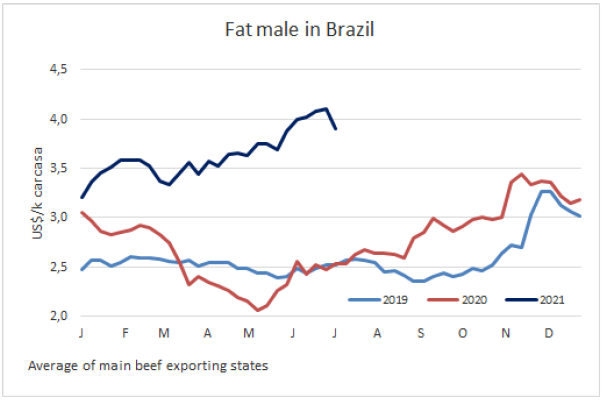 6月牛肉出口平均價(jià)格保持強(qiáng)勁上漲趨勢(shì),六月均價(jià)達(dá)5181美元/噸,較上月上漲了5%,達(dá)2011年11月至今10年來(lái)最高水平。當(dāng)時(shí)的巴西牛肉出口量?jī)H為目前出口量的一半,當(dāng)時(shí)巴西國(guó)內(nèi)市場(chǎng)非常強(qiáng)勁,美元對(duì)雷亞爾的匯率約1.75。六月巴西牛肉出口量達(dá)140315噸,保持同比下跌趨勢(shì),但是今年目前為止最大的單月出口量。今年前半年巴西牛肉出口量達(dá)735828噸,低于2020年同期。預(yù)計(jì)今年巴西牛肉出口量將低于2020年15萬(wàn)噸。去年巴西牛肉出口量173萬(wàn)噸。