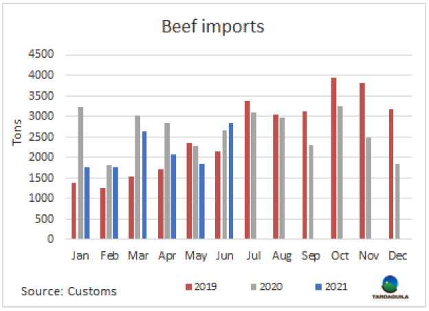 6月份烏拉圭牛肉進(jìn)口量達(dá)到2837噸,是今年以來(lái)最高的單月進(jìn)口量,首次超過(guò)去年同期。其中冰鮮牛肉進(jìn)口量2600噸,冷凍牛肉進(jìn)口量237噸。冷凍牛肉進(jìn)口量包括1103噸前部位肉,平均價(jià)格為每噸4569美元,1497噸后部位肉,平均價(jià)格5059美元/噸。盡管巴西仍然是主要的冰鮮牛肉進(jìn)口來(lái)源國(guó),從巴西進(jìn)口量1784噸,從巴拉圭牛肉進(jìn)口量達(dá)798噸,較之前的月份翻了一倍。Abasto Santa Clara仍未最大的進(jìn)口商,6月進(jìn)口量595噸,其次是Maufe,進(jìn)口量461噸,Carrasco排在第三位,進(jìn)口量255噸。今年上半年累計(jì)牛肉進(jìn)口量12929噸,較2020年同期減少了18%。