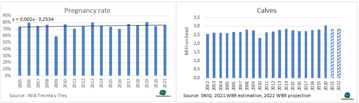 INIA Treinta y Tres組織的畜牧研討會(huì)在其第19版中的數(shù)據(jù)表明,母牛妊娠率約76.4%。這一結(jié)果比2020年高出1.5個(gè)百分點(diǎn),并且考慮到育種群體中雌牛數(shù)量相對(duì)穩(wěn)定,這表明明年春季小牛產(chǎn)量將有適當(dāng)增長(zhǎng)。盡管畜牧種群樣本不具有完全代表性,根據(jù)近年來(lái)的情況,可以估計(jì)該畜牧場(chǎng)的妊娠率與全國(guó)10.4%的斷奶率將有一定的下降。因此,斷奶率預(yù)計(jì)達(dá)66%。目前尚不清楚種牛的數(shù)量,但預(yù)計(jì)將在432萬(wàn)頭左右,比2020年略低(約3萬(wàn)頭)。綜合考慮,截至2022年6月30日,犢牛數(shù)量將達(dá)約285萬(wàn)頭,略高于今年的預(yù)測(cè)的281萬(wàn)頭。盡管母牛和犢牛的數(shù)量都低于2019年的高峰,2019年?duì)倥?shù)量達(dá)302萬(wàn)頭,此前斷奶牛犢數(shù)量達(dá)280萬(wàn)頭以上的記錄并不多見(jiàn)。