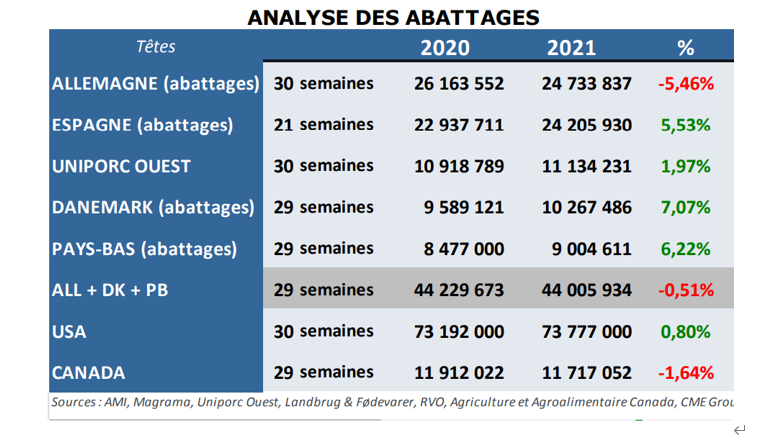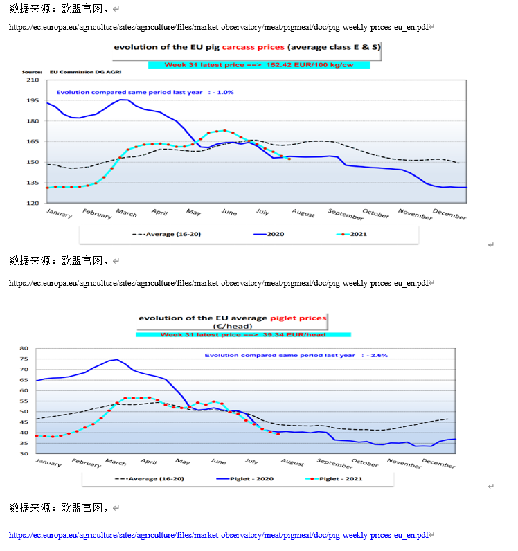 2021年歐盟7月豬胴體均價1.52歐元/kg,環(huán)比下滑6.23%,同比下滑0.46%。7月歐洲本地消費(fèi)恢復(fù)緩慢。另外,中國豬肉進(jìn)口需求疲軟,豬價承壓下行。丹麥豬胴體價格1.58歐元/kg,環(huán)比下跌8%,同比下跌5.5%。德國豬胴體價格1.49歐元/kg,環(huán)比下跌5%,同比下滑13%。西班牙豬胴體價格1.69歐元/kg,環(huán)比下跌9.9%,同比上漲7.3%。
