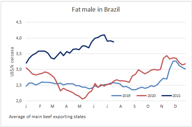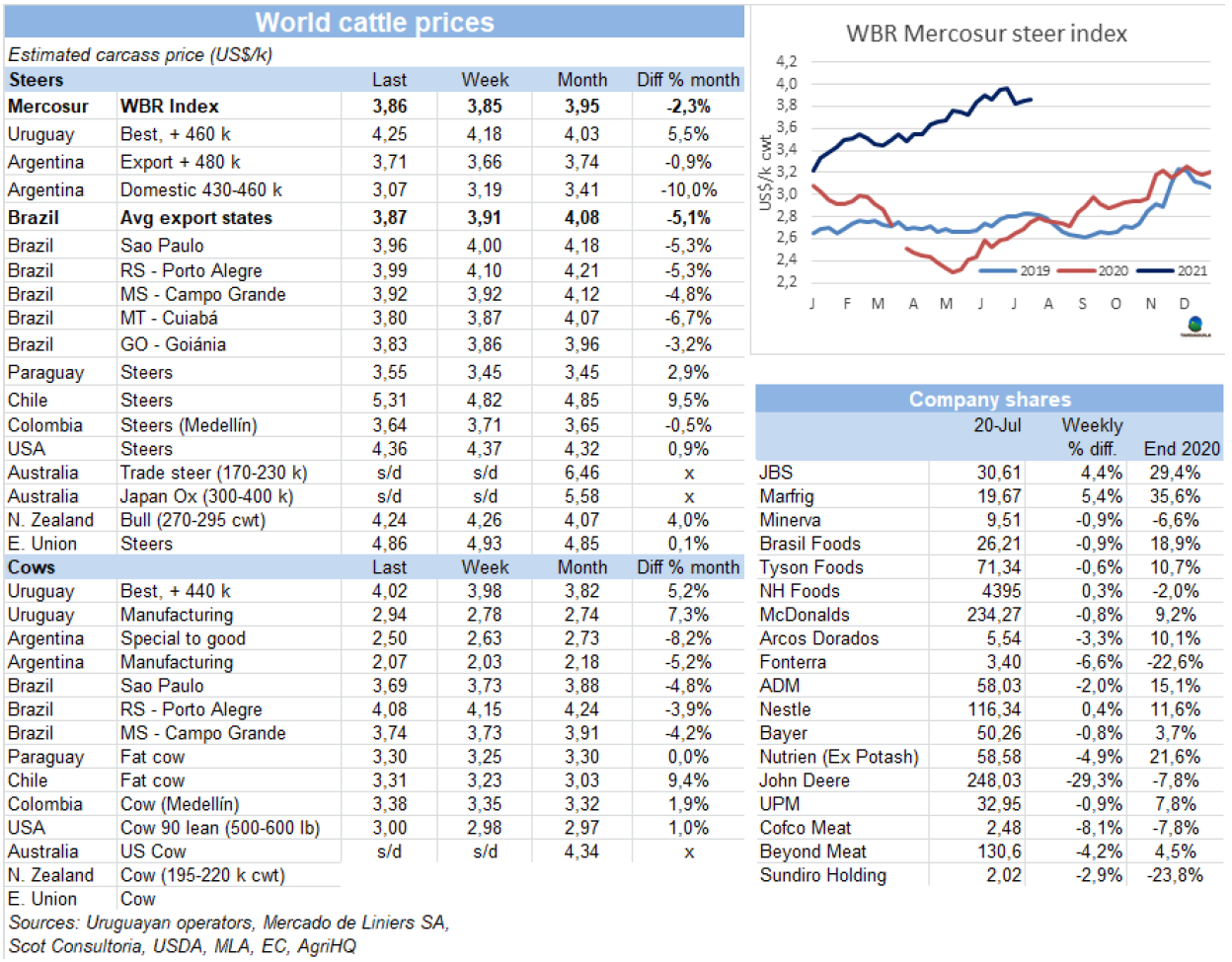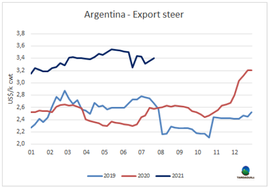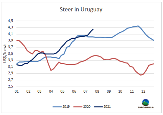 6月閹牛類型價(jià)值1261美元/頭,較上月增長(zhǎng)了65美元,達(dá)2020年1月至今17個(gè)月以來(lái)的最高。烏拉圭肉協(xié)報(bào)告稱本月閹牛類型價(jià)值增加的原因是出口部位肉價(jià)格上漲和國(guó)內(nèi)市場(chǎng)胴體價(jià)格、副產(chǎn)品和鮮皮價(jià)格上漲?;钆2少?gòu)價(jià)格上漲了37美元/頭,因此兩者的價(jià)差工業(yè)增加值增長(zhǎng)了29美元至214美元,工業(yè)增加值增長(zhǎng)了1.5%至17%,如果價(jià)值低于20%,則認(rèn)為該行業(yè)很難實(shí)現(xiàn)正利潤(rùn)。