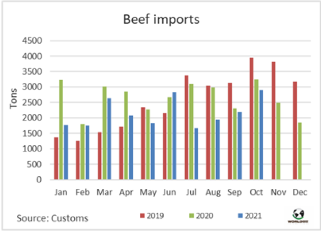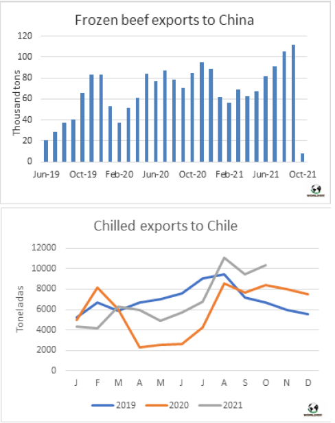 烏拉圭和該地區(qū)其他國(guó)家10月份的牛價(jià)差異很大,導(dǎo)致牛肉進(jìn)口量每月增加700多噸,主要是后部位肉。根據(jù)海關(guān)數(shù)據(jù),2909噸新鮮牛肉進(jìn)入該國(guó),其中2765噸是冰鮮牛肉。十月冰鮮牛肉的平均價(jià)格為4974美元/噸,略高于九月1.5%。這是因?yàn)楹蟛课蝗膺M(jìn)口量在總進(jìn)口量中占比大大增加,從9月的1303噸增至10月的2088噸,而前部位肉的采購(gòu)量仍維持在670噸左右。巴西是冰鮮牛肉的主要進(jìn)口來源國(guó),其中91%的進(jìn)口冰鮮牛肉來自巴西,其余的來自巴拉圭。10月進(jìn)口量最大的公司是Abasto de Carnes Saturno(511噸),其次是Santa Clara(475噸)和Maufe(381噸)。截至今年10月,烏拉圭累計(jì)牛肉進(jìn)口量21647噸,比2020年同期減少了21%。