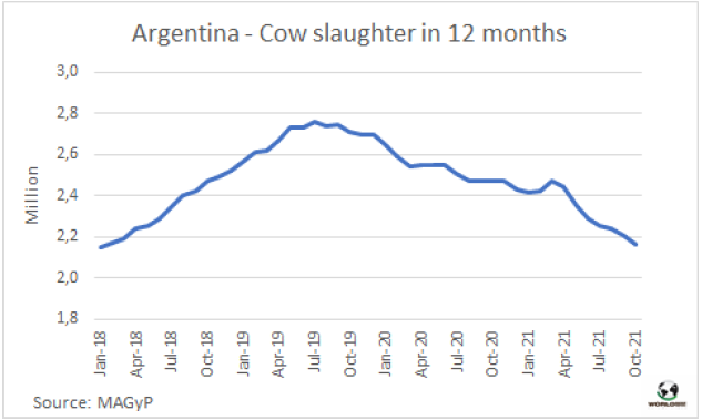10月阿根廷牛屠宰量同環(huán)比下降了3%,同比下降了16%