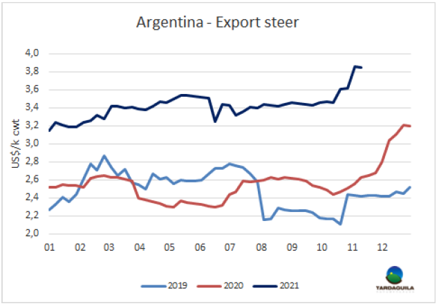自6月份以來,牛屠宰量一直在下降。分析師認(rèn)為,這種下降很大程度上與育肥場(chǎng)正在經(jīng)歷的困難有關(guān),育肥場(chǎng)面臨高昂的投入成本,而這些成本無法向牛價(jià)轉(zhuǎn)化?!跋鄬?duì)而言,11月和12月的屠宰量將會(huì)下降更多,這兩個(gè)月通常是屠宰活動(dòng)活躍的月份。目前育肥的最后一個(gè)階段還沒有完成,但我們看到盈利能力下降,我們意識(shí)到,牛被宰殺用來消費(fèi)銷售價(jià)值幾乎損失了15%,大約每頭1萬比索。我們11月的待宰牛供應(yīng)會(huì)比較少,12月的供應(yīng)更緊缺,更不用說1月、2月和3月了,”AgroVa電臺(tái)節(jié)目的專家表示。