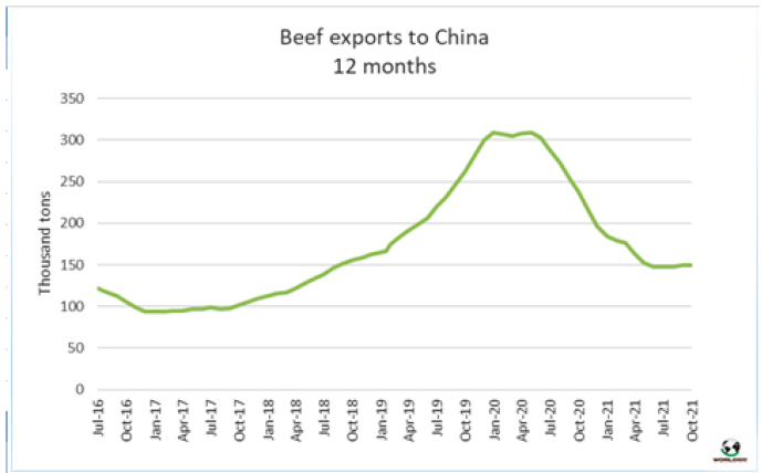 2019年底至2020年上半年期間,澳大利亞對(duì)中國(guó)牛肉出口量從每年略高于30萬噸的高峰急劇下降后,自去年6月以來的12個(gè)月里,澳大利亞對(duì)中國(guó)牛肉出口量穩(wěn)定在15萬噸左右。出口量為30萬噸時(shí),對(duì)中國(guó)出口量在澳大利亞出口中占25%,目前出口占比降至16-17%。