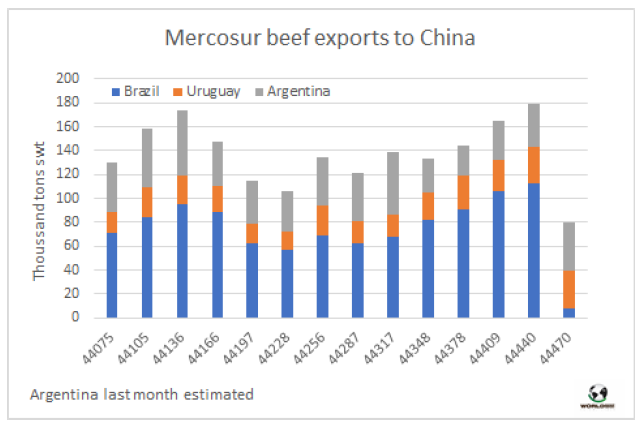 10月南美市場(chǎng)對(duì)中國(guó)牛肉出口量下降了約10萬噸