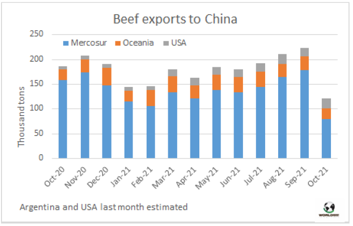 歐洲迎來了第四波新冠疫情后,各國政府采取的不同的措施使出口市場非常悲觀,持續(xù)至十月中旬的上漲趨勢結(jié)束。阿根廷方面的消息人士稱希爾頓配額產(chǎn)品很難賣,因?yàn)橐恍┛蛻粼谛乱徊ㄒ咔榈絹頃r(shí)不愿意采購,因?yàn)槭掷镉幸恍齑?,加上即將到港的敞口,他們認(rèn)為不需要更多了。另一位經(jīng)理人稱甚至有一些取消合同的情況,阿根廷臀腰肉價(jià)格下跌到13000美元/噸,現(xiàn)在還有更低一檔的參考價(jià),12500-12700美元/噸,今年年底市場會(huì)好轉(zhuǎn)的希望渺茫。