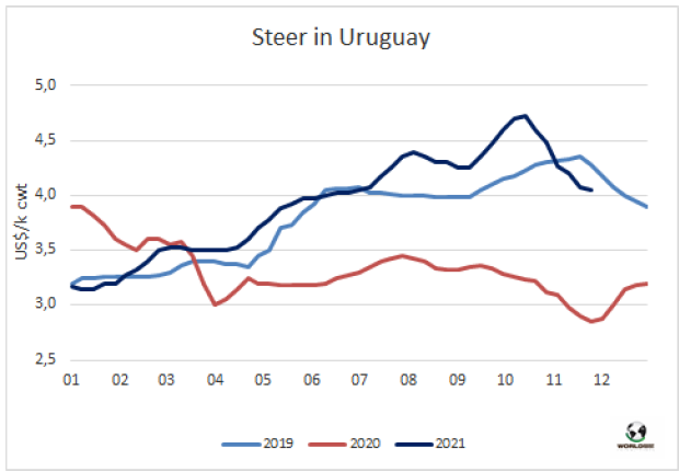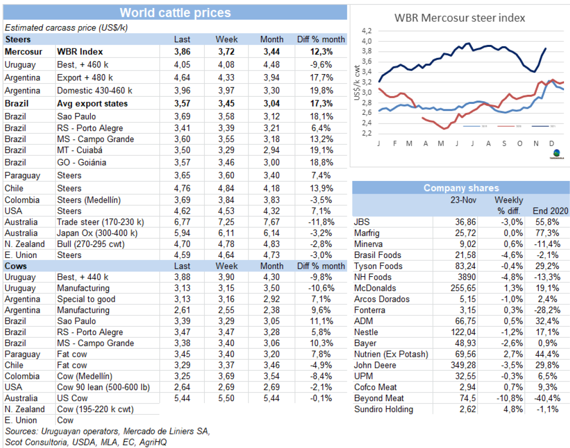 本周南方共同市場閹牛價(jià)格指數(shù)再次強(qiáng)勁上漲,達(dá)3.86美元/公斤,較上周上漲了14美分,達(dá)九月初以來最高水平。本周的上漲主要受到巴西和阿根廷牛價(jià)上漲的支撐,阿根廷育肥閹牛價(jià)格上漲至南美地區(qū)最高水平,本周參考價(jià)4.64美元/公斤,較上周上漲了31美分,較十月中旬累計(jì)上漲了87美元/公斤。巴西牛價(jià)繼續(xù)強(qiáng)勁恢復(fù),但仍未南美地區(qū)牛價(jià)最低的國家,盡管巴西雷亞爾貶值2.1%。巴拉圭牛價(jià)繼續(xù)上漲,本周上漲了5美分至3.65美元/公斤。烏拉圭方面情況相反,盡管牛價(jià)急劇下行的趨勢已經(jīng)結(jié)束,但特種閹牛價(jià)格在4.05美元/公斤上下波動(dòng)。