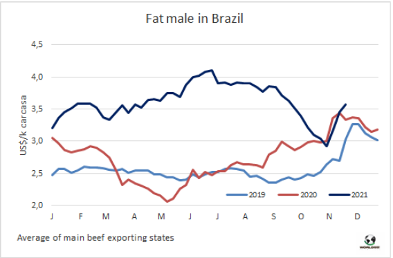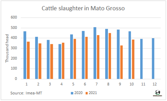 據(jù)馬托格羅索農(nóng)業(yè)經(jīng)濟(jì)研究所統(tǒng)計(jì),與9月相比,馬托格羅索州牛屠宰量增長了5.8萬頭,達(dá)38.639萬頭,較2020年同期下降了8.2萬頭,約下降了17.5%。本月屠宰量的增長主要集中于公牛屠宰量的增加,約28.424萬頭,較9月增長了6.9萬頭。育肥場出欄的公牛數(shù)量增長給公牛屠宰量增長提供支撐,主要為12-24月齡的牛,約11.429萬頭。相反,母牛屠宰量較9月下降了1萬頭?!?span>11月待宰牛數(shù)量較少,因?yàn)檗r(nóng)民預(yù)期成品牛的價(jià)格會(huì)提高,因此將大部分牛被壓欄?!?span>