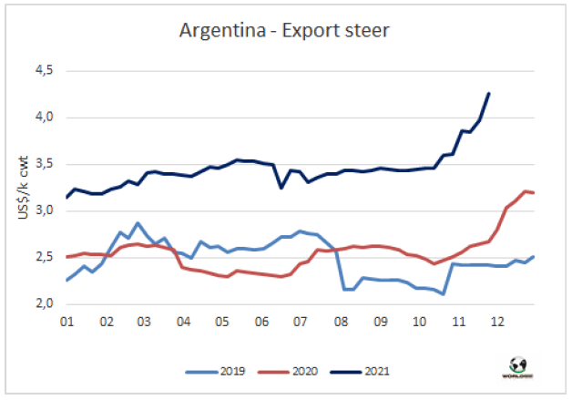 上周活牛價(jià)格保持上漲趨勢,本周出口閹牛價(jià)格上漲了20-30比索/公斤,質(zhì)量最好的英國純種閹牛參考價(jià)410-430比索/公斤,澤布雜交牛價(jià)參考價(jià)400-420美元/公斤,質(zhì)量最好的母牛價(jià)格上漲了20比索至340-350比索/公斤,工業(yè)母牛參考價(jià)上漲了15比索至290-300比索/公斤。僅上個(gè)月出口閹牛的比索價(jià)格上漲了18%-20%,特優(yōu)母牛價(jià)格上漲了17%,工業(yè)母牛價(jià)格上漲了13%。其主要原因是日益增長的出口需求(每月3500噸猶太潔食屠宰配額和希爾頓部位肉的屠宰計(jì)劃更好的整合,加上481配額的預(yù)期發(fā)貨和向中國出口的5000噸母牛產(chǎn)品配額),盡管在通貨膨脹嚴(yán)重的背景下出口帶來的價(jià)值略有延遲。