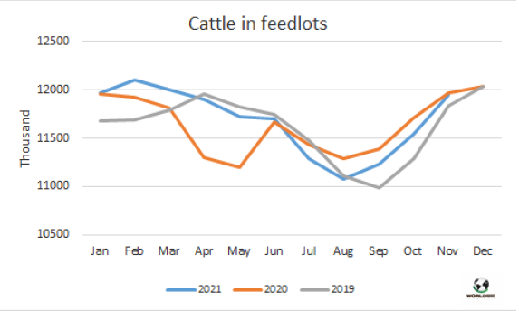 美國農(nóng)業(yè)部11月1日發(fā)布的育肥牛存欄預(yù)估約1190萬頭,較去年同期略有下降。10月補(bǔ)欄量225萬頭,較2020年10月增加了2%。育肥牛出欄量179萬頭,較去年下降了5%。