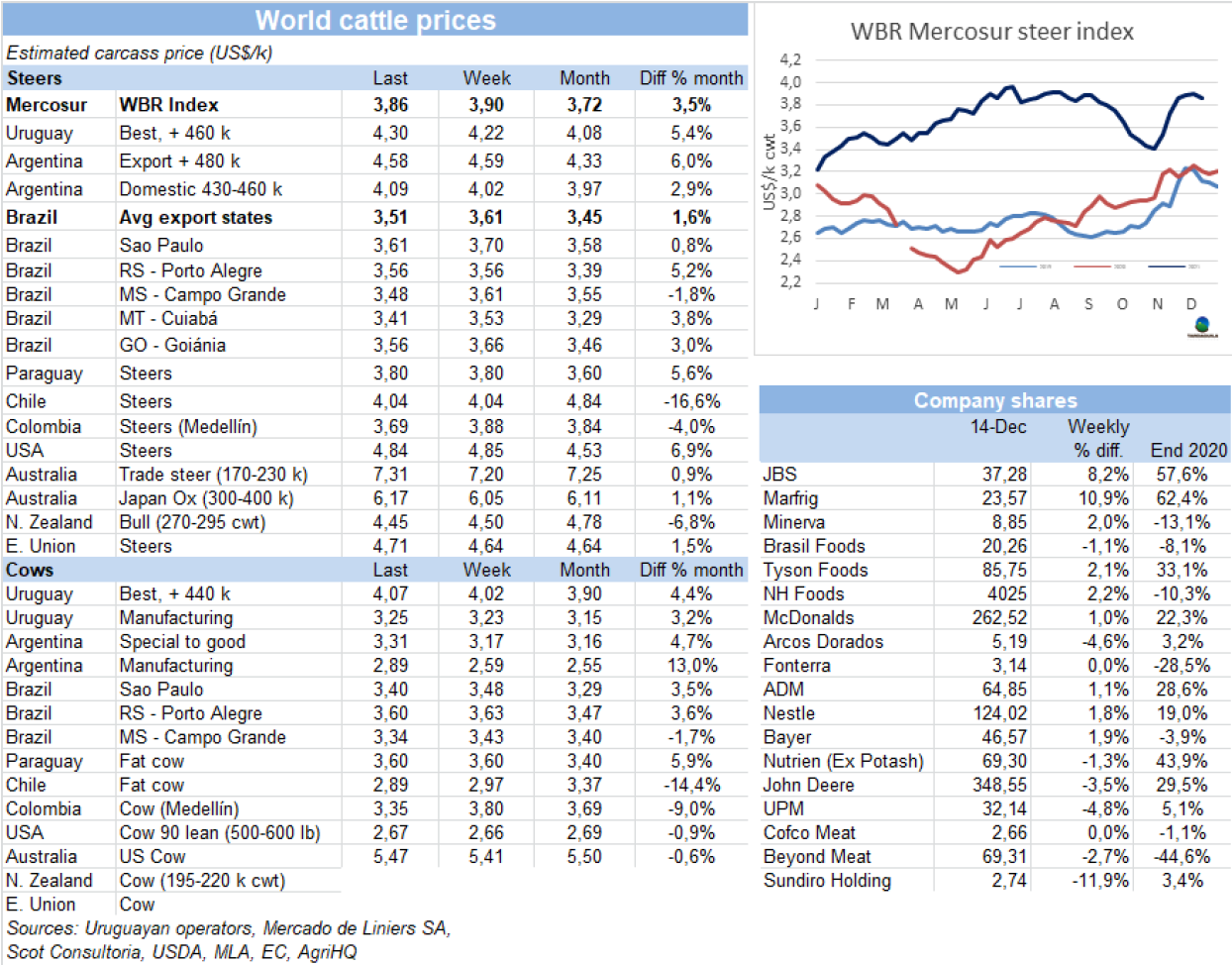 本周南方共同市場閹牛價格指數(shù)在連續(xù)五周的上漲之后下跌,本周下跌了4美分至3.86美元/公斤。該指數(shù)下跌的主要原因是巴西育肥牛雷亞爾價格下滑。此外,巴西雷亞爾兌美元匯率下跌了0.9%,巴西主要出口州育肥牛價格本周下降了10美分至3.51美元/公斤,與其他地區(qū)相比,巴西的價格拉開了與其他地區(qū)牛價的差距。相反烏拉圭市場堅挺,特種重型閹牛貿(mào)易參考價4.3美元/公斤。阿根廷和巴拉圭市場保持穩(wěn)定,阿根廷出口閹牛參考價在4.58美元/公斤,巴拉圭參考價3.8美元/公斤。